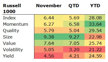In November, the Size factor saw the highest gain at 9.38%, significantly outperforming the broad index’s 6.44% gain. This recent surge in the Size factor may be attributed to the impact of tariffs, which have made smaller large-cap stocks more attractive due to their lower exposure to international trade and supply chain disruptions. Meanwhile, the Yield factor has the lowest November return at 4.56%, highlighting the impact of higher rates on dividend stocks. The notable change in November, with the Size factor outperforming, contrasts with the broader trends observed over the past four years indicating a potential broad investor shift away from the larger names in the index.