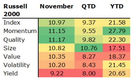 In November, the Quality factor saw the highest gain at 11.17%, slightly outperforming the broad index’s 10.97% gain. Meanwhile, the Yield factor has the lowest November return at 9.22%, a similar trend seen in large caps. The strong performance of the Momentum factor could be attributed to investors flocking into the asset class broadly post-election. The recent outperformance of the Quality factor may be due to investors rotating into small-cap stocks broadly post-election, driven by expectations of lower taxes, increased domestic production, and potential benefits from a U.S.-first policy.