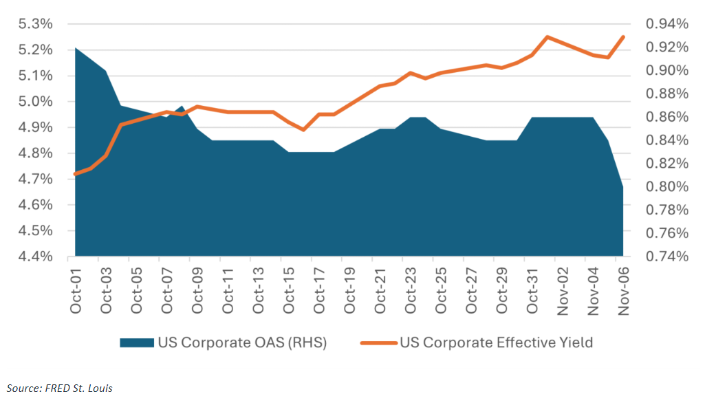 U.S. government bond yields increased due to anticipated fiscal expansion, larger deficits, and inflationary pressures. Trump’s victory had minimal impact on market expectations regarding the Federal Reserve’s cutting cycle, with projected rate cuts for 2024 and 2025 remaining unchanged. Credit spreads tightened, indicating a risk-on sentiment in the markets following the election.