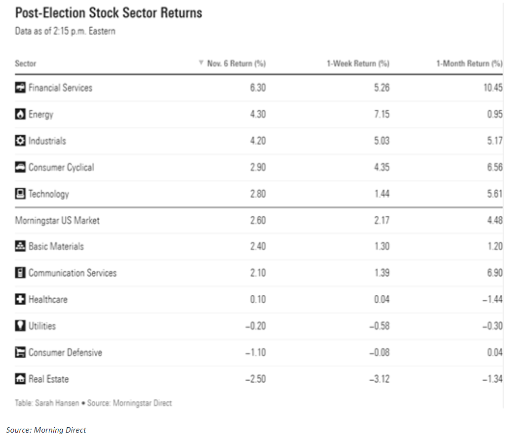 Last week saw U.S. elections take center stage as Donald Trump was reelected, winning both the electoral vote and popular vote. Additionally, Republicans won a majority in the Senate while the House is still up in the air as 19 races are still too close to call. Markets rallied in futures on early Wednesday morning, leading to a strong rally that persisted through the end of the week. In this week’s spotlight, we analyze some of the market’s reaction to Trump’s victory.