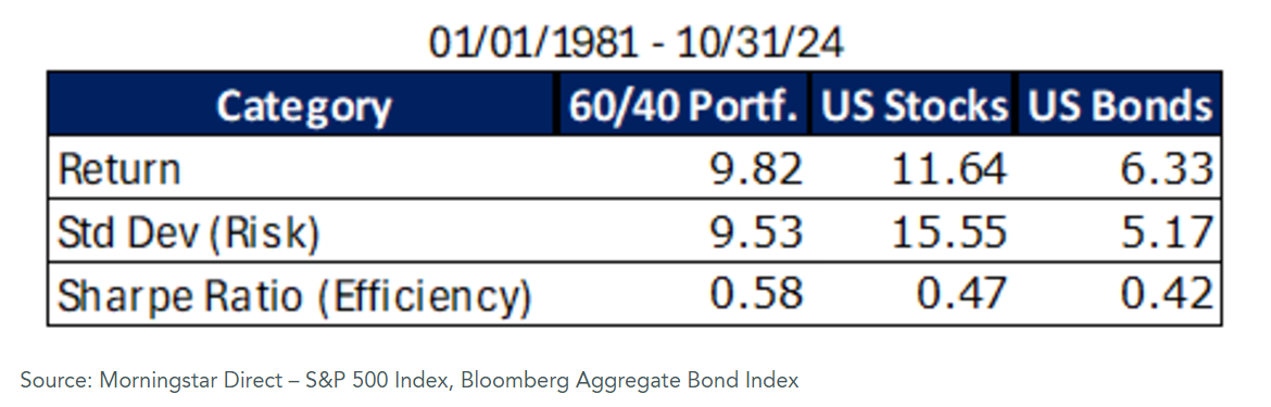 The 60/40 portfolio has become more than a theory, and over the past 70 to 80 years, essentially became the gold standard of investment allocation. Below is a chart for return, risk, and efficiency ratios from January 1, 1981 to October 31, 2024, for a hypothetical 60/40 portfolio (all numbers have been annualized):