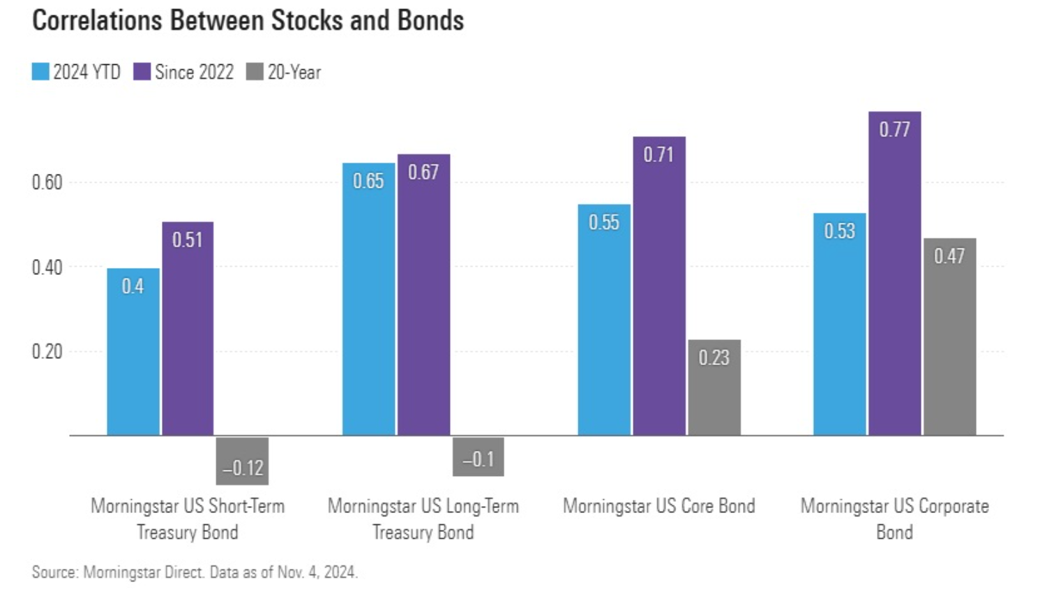 3 Albrecht, Bella. “‘Diversification Is Back’—Why 60/40 Portfolios Are Working.” Morningstar, Inc., November 8, 2024. Accessed November 14, 2024. https://www.morningstar.com/markets/diversification-is-backwhy-6040-portfolios-are-working.