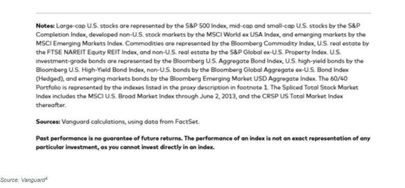 The strategy will remain relevant because it is built on a fundamental tenet of finance: diversification. In short, the 60/40 portfolio is not dead because diversification is not dead. The below graph provides a reference for how diversification is helpful in smoothing out the volatility of asset class returns.