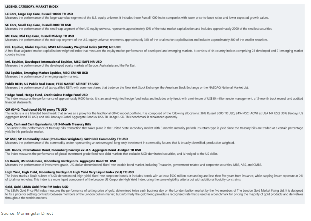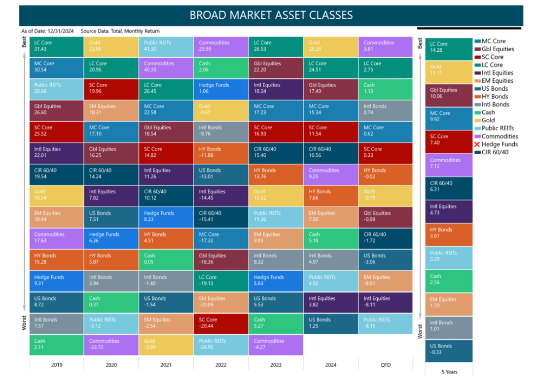 In 2024, Gold, Large Cap Core equities, and Global Equities emerged as top performers. U.S. Bonds underperformed, while Commodities, represented by the S&P GSCI, rallied in the fourth quarter. This rally was driven by gains in industrial metals, gold, and various agricultural commodities. U.S. real estate investment trusts (REITs) lagged behind the broader market in the last quarter of the year.
