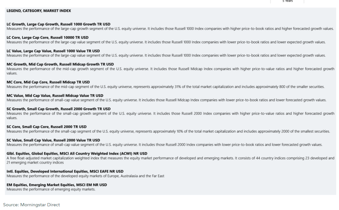 For 2024 and Q4 2024, Growth outperformed Core and Value, while U.S. Equities (represented by the Russell 3000) outperformed International Equities and Emerging Markets and (represented by MSCI EM and MSCI EAFE) on a Total Return basis (24.51% versus 7.50% versus 3.82%).