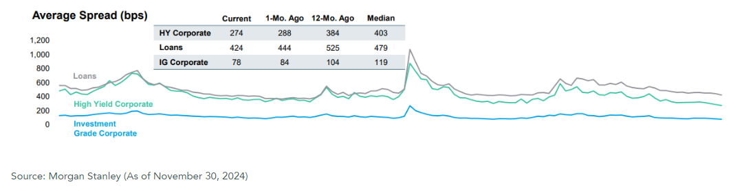 Corporate credit spreads across all segments—including high yield bonds, investment-grade bonds, and leveraged loans—remained relatively stable throughout the fourth quarter of 2024. However, these spreads tightened significantly over the trailing 12-month period. This compression was due to improved risk appetite, expectations of continued economic growth, and anticipation of a supportive monetary policy environment.